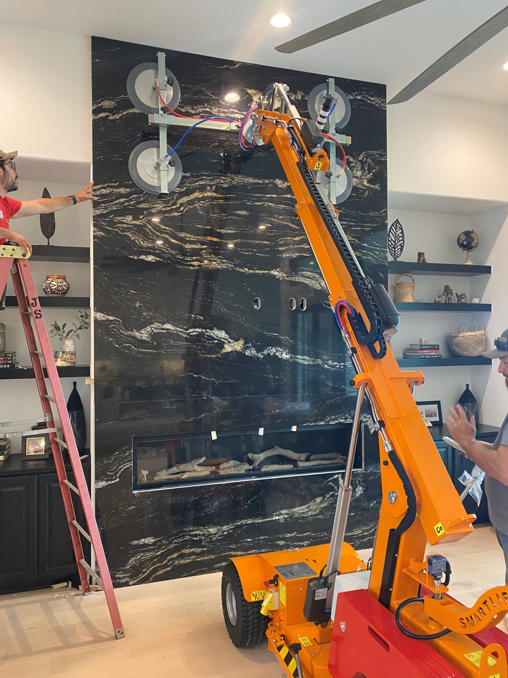 Den stærke vakuumløfter SL 609 HLE kan løfte op til 600 kg og nå op i en løftehøjde på 415 cm. Den er nem at transportere sammen med de store pejsevægge og fylder kun 83 x 228 cm under transport. Også når den er i brug, er løfteren kompakt, hvilket gør den perfekt til at manøvrere i små rum og gennem smalle døråbninger i private boliger.