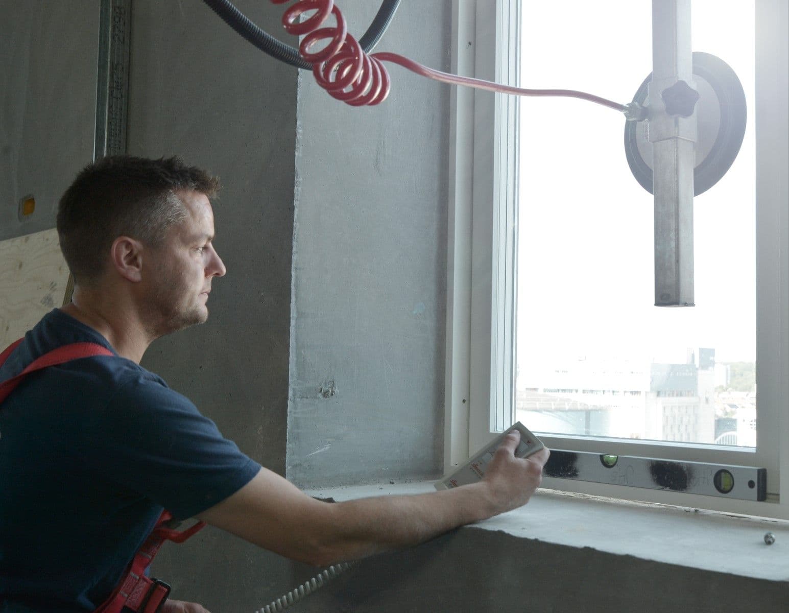 Lige nu arbejder jeg alene med at installere de her vinduer, der vejer op til 175 kg - mens de andre folk er optaget af andre opgaver på etagen. Jeg er helt fri for tunge løft og kan montere op til 16 vinduer på en dag, hvis det skal gå rigtigt stærkt. Akkorden er på 8, så det går fint."