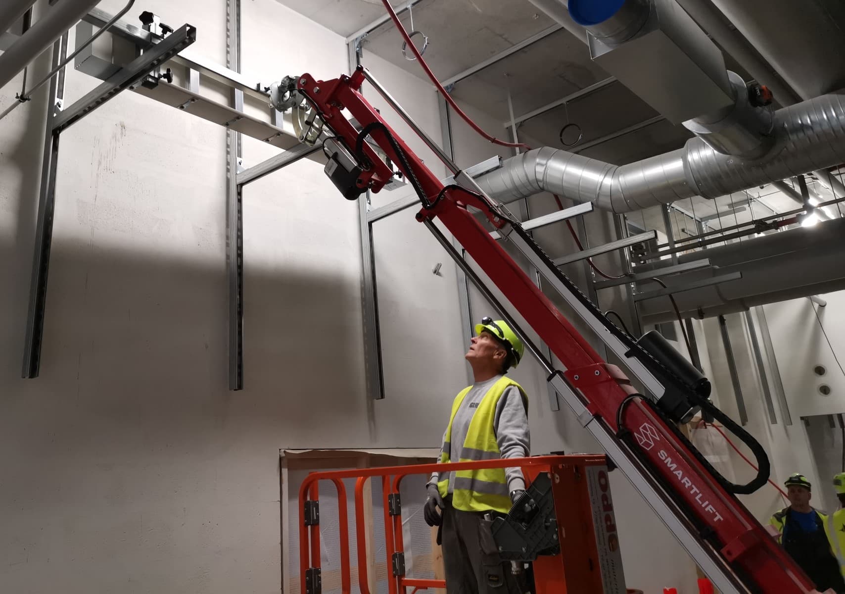 Det er et komplekst projekt. Kompleksiteten ses ved, at vi skal montere strømskinnerne både lodret og vandret i bygningen, og derfor skal vi bruge en fleksibel maskine under monteringen af strømskinnerne. Smartlift giver den nødvendige fleksibilitet, så vi kan montere strømskinnerne sikkert og præcist