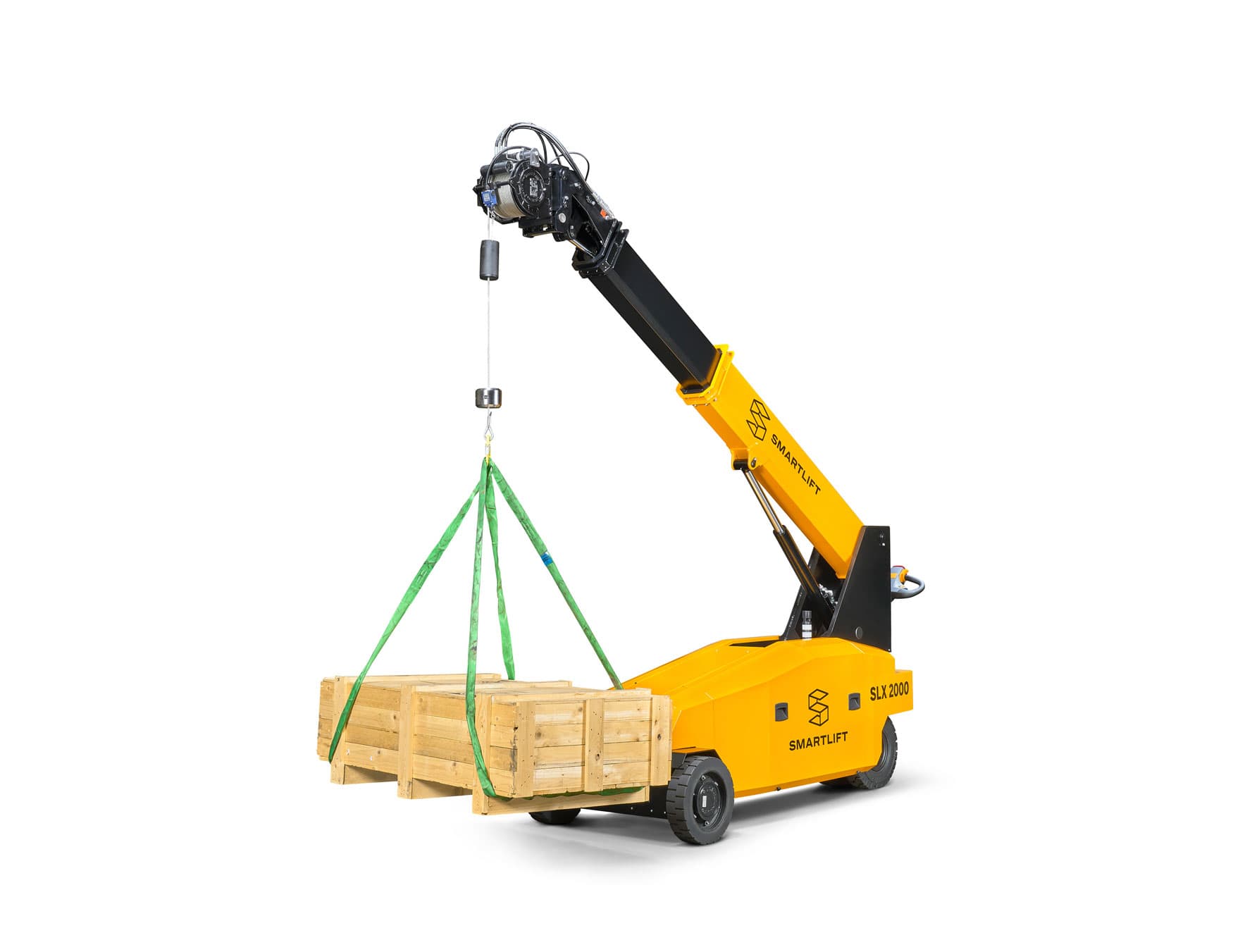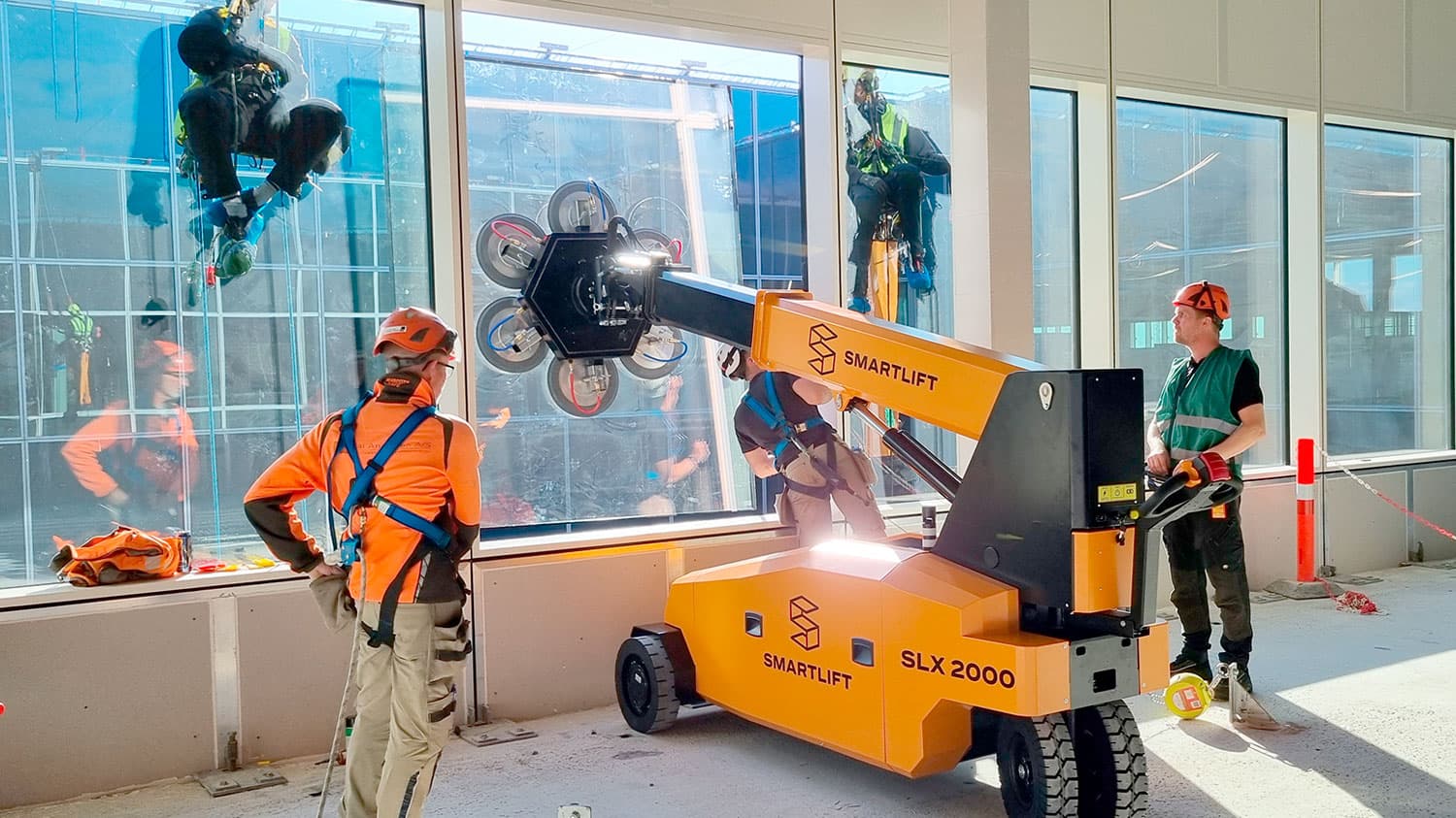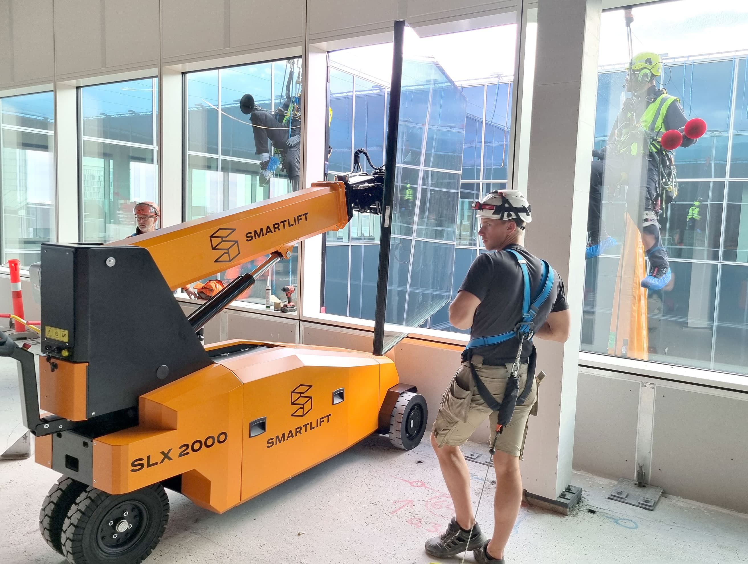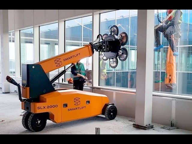 SLX 2000 ist eine neue und leistungsstarke Hebelösung für verschiedenste Aufgaben. Sie kaufen eine Basismaschine und wählen dann das passende Hebewerkzeug entsprechend Ihren Anforderungen. Die Tragfähigkeit hängt vom montierten Werkzeug ab: Vakuumtraverse, Hydraulikwinde, Fly-Jib, Palettengabeln oder Lasthaken. Die Maschine eignet sich besonders für Glasfassadenprojekte, bei denen Sie dasselbe Gerät verwenden können, um das Fassadenglas im Gebäude zu bewegen und es anschließend von innen nach außen zu montieren. Das spart Zeit und Kosten. Mit dem Schnellwechselsystem lassen sich Werkzeuge einfach und schnell tauschen. Funktionen und (optionale) Fahrbewegung werden per Fernbedienung gesteuert, und die Servolenkung erleichtert das Manövrieren. Die Vakuumtraverse kann 88° zur Seite drehen, und das schmale Fahrgestell macht den SLX 2000 ideal für beengte Platzverhältnisse. Die Maschine wird ohne Hebewerkzeug geliefert. Zubehör ist separat erhältlich.