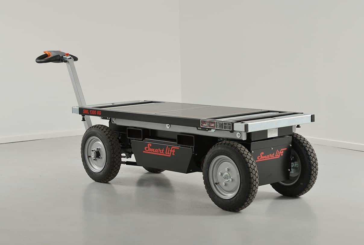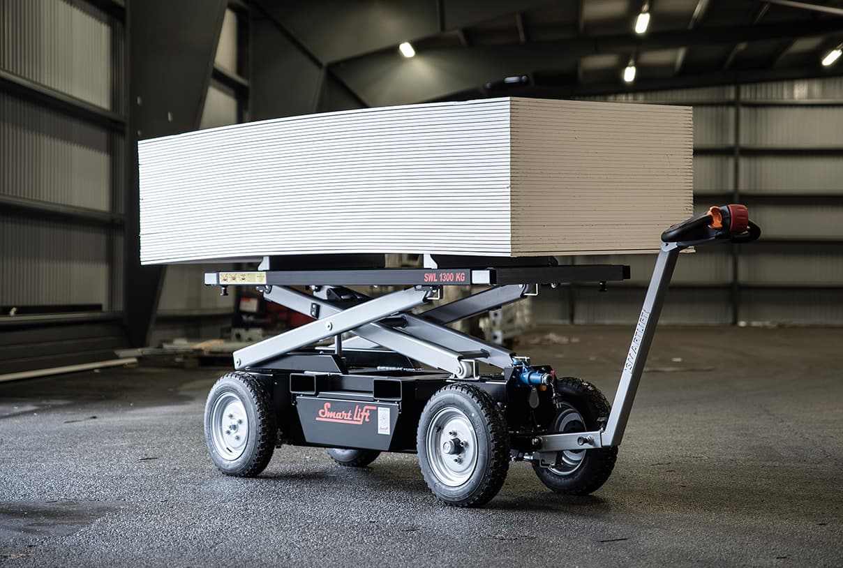 Ein robuster und selbstfahrender Transportwagen für Gipskartonplatten und andere Baumaterialien ist der ST 1300 Trolley. Er ist mit einem elektrischen Hubmechanismus ausgestattet, der sich bis zu 86 cm über den Boden erstreckt. Dadurch kann er als flexible Arbeitsbank auf der Baustelle genutzt werden, um eine verbesserte Ergonomie zu gewährleisten. Zusätzlich verfügt der Wagen über zwei Seitentaschen, die es ermöglichen, ihn mit einem Gabelstapler zwischen den Etagen eines Gebäudes zu transportieren.