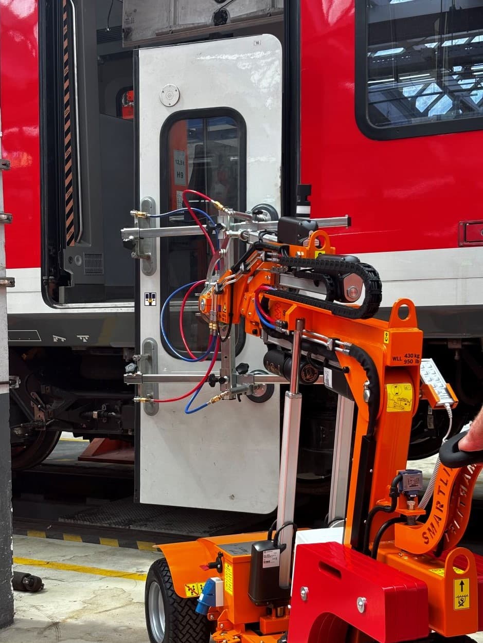 The vacuum lifter, the latest generation SL 409 HLE RT, takes over alle the heavy lifting tasks in the train workshop.