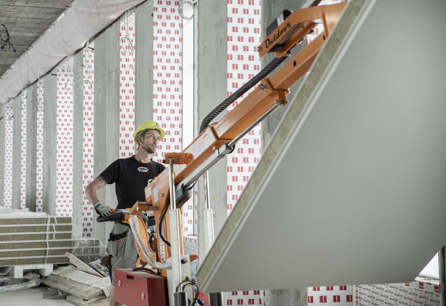 Utmaningen är hur man hanterar Paroc-panelerna som är mer än fyra meter långa och för stora för att hanteras manuellt. Teamet använder en SL 608 HLE RT med roterande åk för att hantera och placera panelerna exakt. Detta skyddar medarbetarna från mycket kroppslig belastning under de månader som projektet pågår.