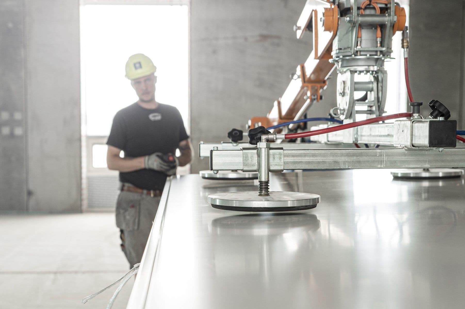 Vakuumlyftaren lyfter panelerna från horisontellt läge och transporterar dem till schaktet. Här placeras panelerna genom ett samarbete mellan båda montörerna, där den ena kör lyften medan den andra fjärrstyr roterande huvudet och justerar panelens placering så att den hamnar exakt där den ska vara.