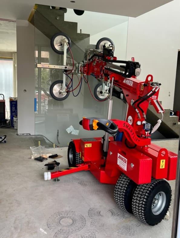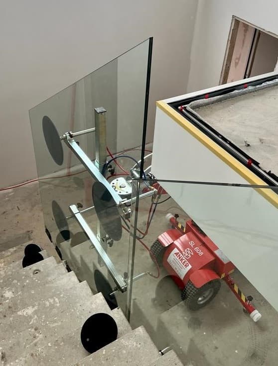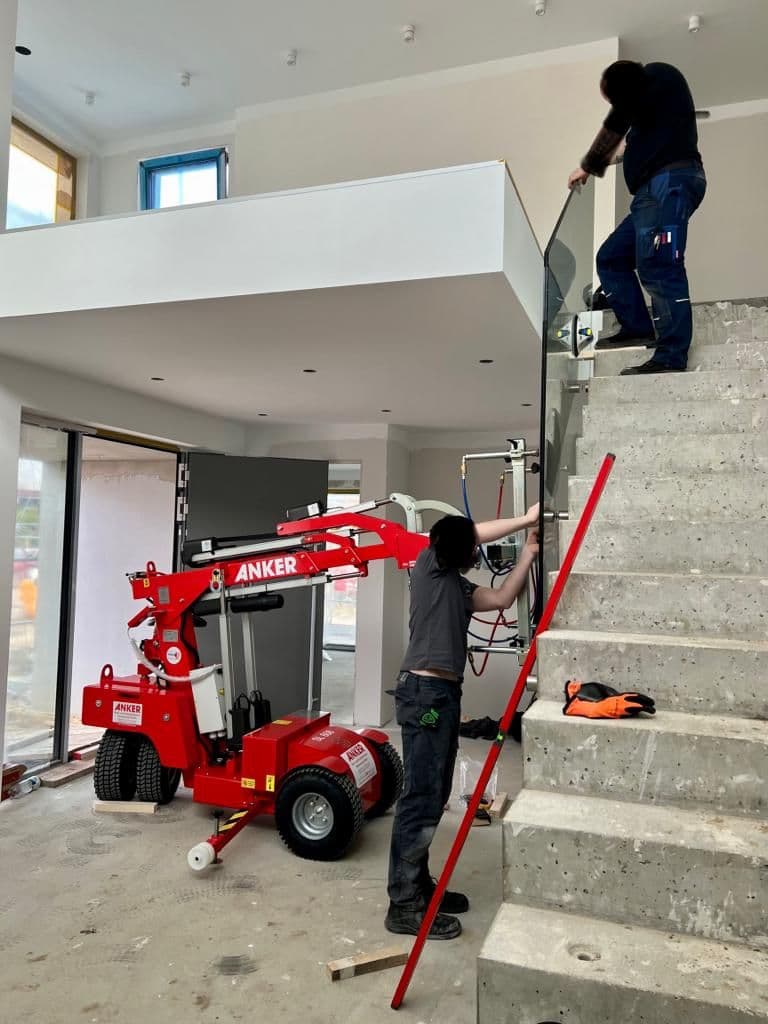 Anker's specialized advisors were tasked with finding a lifting machine for a customer who needed to install glass coverings in a stairwell. This is a unique environment with very little space for equipment and even less space for installers, who would otherwise have to lift the large glass pieces into the stairwell and maneuver the heavy construction elements into place manually.