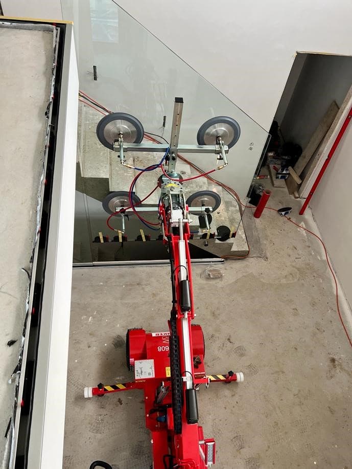 The advisors found the perfect lifter for the job: the SL 608 HLE RT. With a width of only 83 cm, installers can easily maneuver the vacuum lifter around the stairwell, and with a lifting capacity of 600 kg, it handles even the largest glass pieces without difficulty.