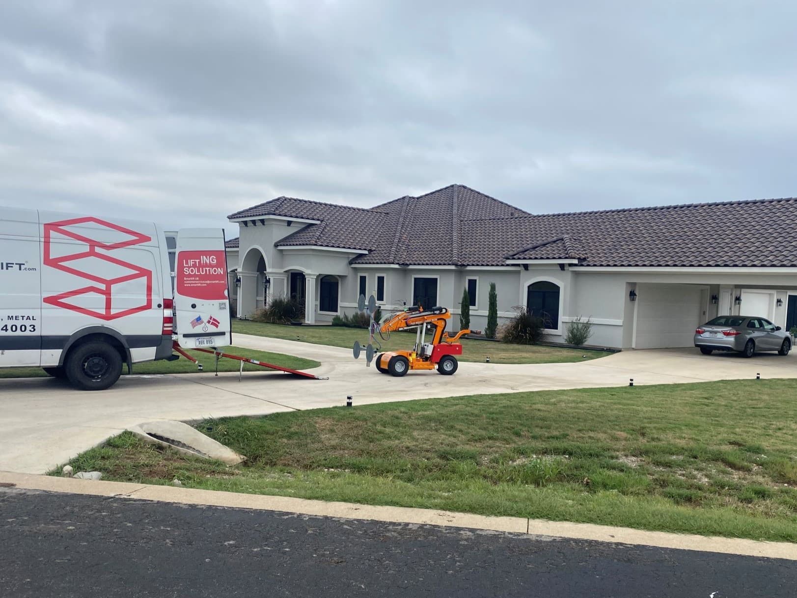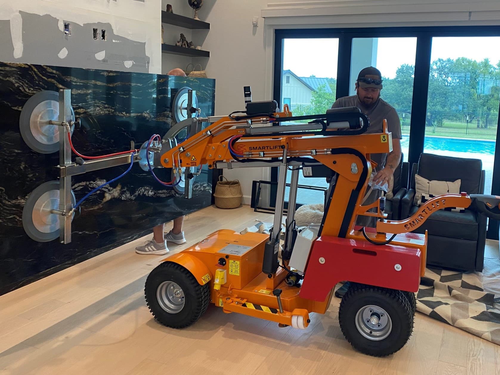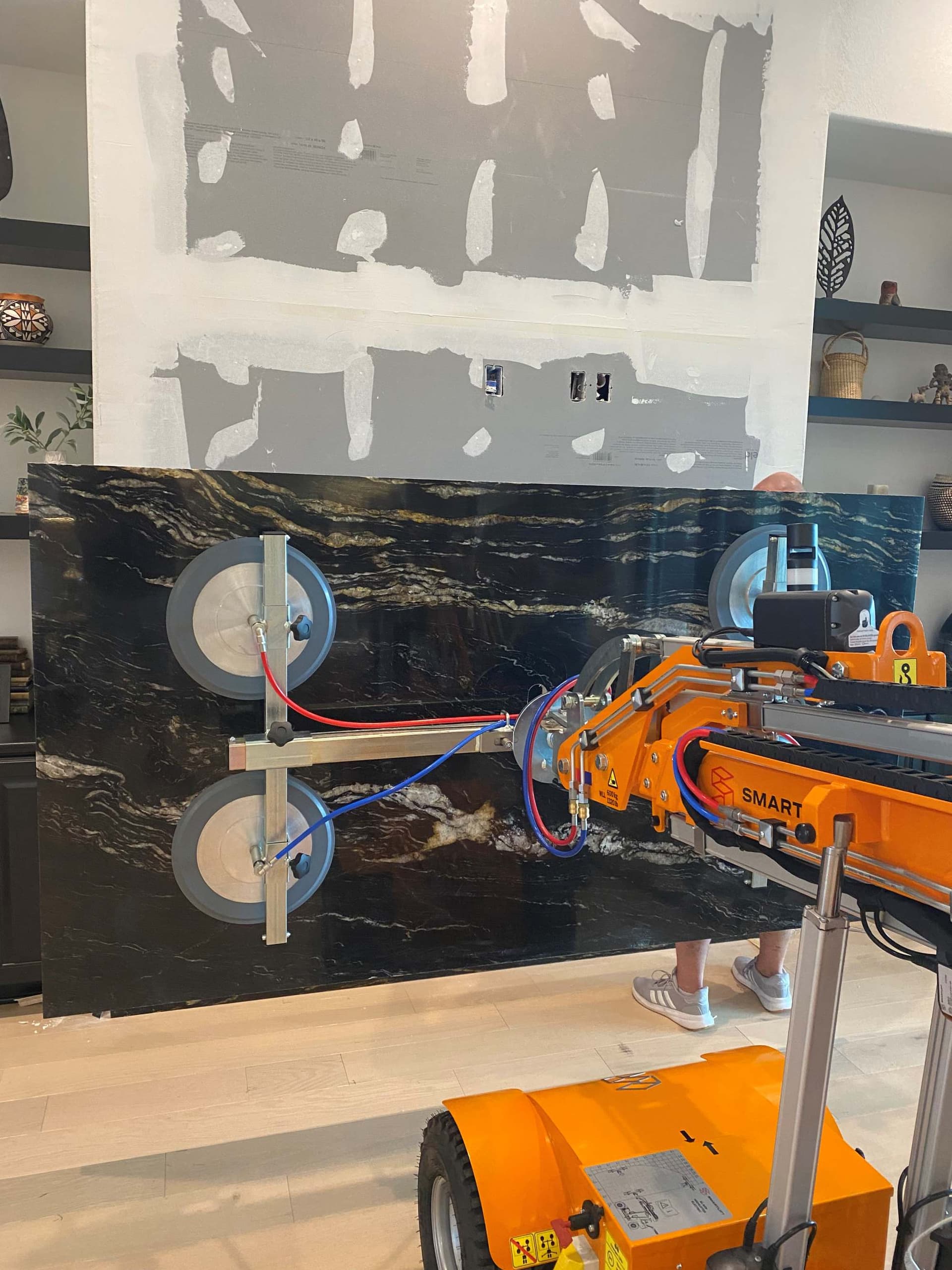 The limited space in private homes presents a challenge which results in difficult heavy lifting for the installation team. Moving a large stone slab from the truck, through the house, and into the living room where it needs to be installed is no easy task. The materials utilized in custom home projects, such as marble and granite, are both large and extremely cumbersome to handle. The installation of a slab fireplace typically takes three to four days, which means a prolonged disruption to the owners of the home. Utilizing Smartlift can decrease that installation down to a single day.