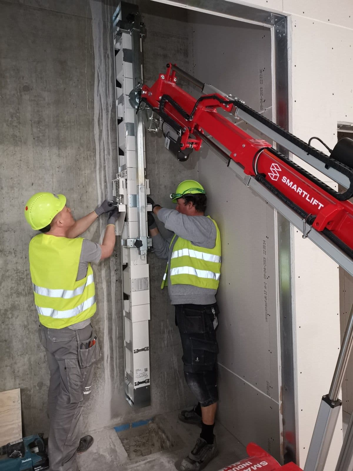 Uggerly Installation is using three SLI 150 Smartlifts, which have a lifting capacity of up to 150 kg. The SLI 150 machines have been designed with a narrow chassis so they can easily move around the building, while, due to the narrow chassis, the Smartlifts can also mount the busbars no matter how confined the space is: “The size of the Smartlift is important for us during the installation work. The Smartlift does not take up a lot of space, so we can easily move it around the rooms during installation.” – Vagner Nørtoft, electrician, Uggerly Installation.